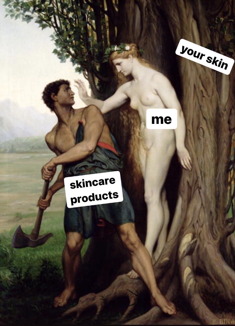 But the big one, I’m convinced, is that environmental exposure is external and impersonal and aging is internal and very personal — and as any marketer will tell you, getting personal moves product. Psychologically, blaming aging begets shame and fear, two very effective motivators. (Society already has major issues with aging, aside from the physical effects — read this story and follow @thenapministry for more on how grind culture and productivity-as-worth factor into our fear of getting older.) Then, the existence of “anti-aging” products and procedures suggests that one can anti-age with enough time/money/effort. And if you theoretically can anti-age (you can’t) and you don’t (which you won’t), your shame and fear get amplified. You spiral. You pour in more time/money/effort, because there’s always a new device/surgery/injectable/miracle ingredient to try, and maybe you’re aging because you haven’t tried hard enough to stop it. I mean, Jennifers Lopez & Aniston are doing it!! It can be done, right? Shame + fear + (false) hope for a solution = a thriving industry.