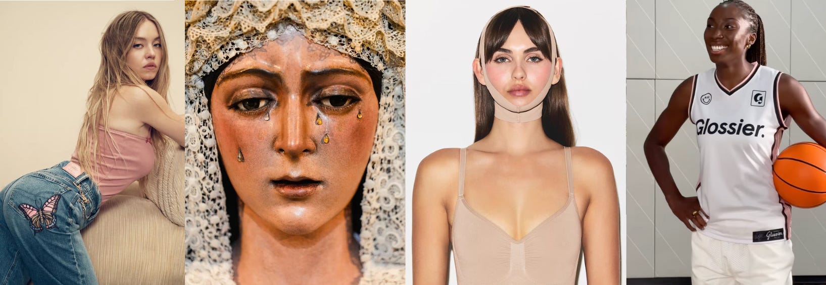Today we’re talking about: Skims’ dystopian skull shapewear [3:50], Alicia Keys’ “It’s Like Skin” foundation [18:40], Anna Delvey’s Trumpian approach to scandal, the politics of beauty’s WNBA takeover [39:00], the “Stretch Armstrong” trend (or the manspreading of garments) [49:35], Sydney Sweeney’s American Eagle ads [56:55], ambient eugenics in the beauty industry [1:10:00], Sydney Sweeney’s bathwater DNA [1:20:00], rage-bait as a gimmick [1:24:55], “The Summer I Turned Pretty” [1:30:25], and the Virgin Mary’s botched glow-up [1:36:00]. Plus more!