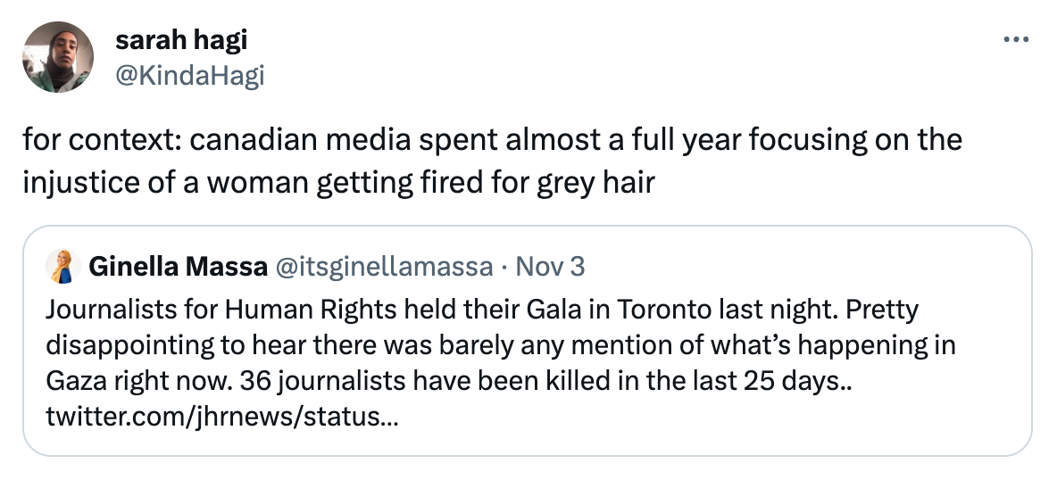 Consider this tweet from Ginella Massa, who pointed out that the Journalists for Human Rights organization “barely … mentioned” the 36 journalists killed in Gaza at its Toronto-based gala in November — nearly a month into the conflict. “For context,” writer Sarah Hagi added, the “Canadian media spent almost a full year focusing on the injustice of [former CTV news anchor Lisa LaFlamme] getting fired for grey hair.”