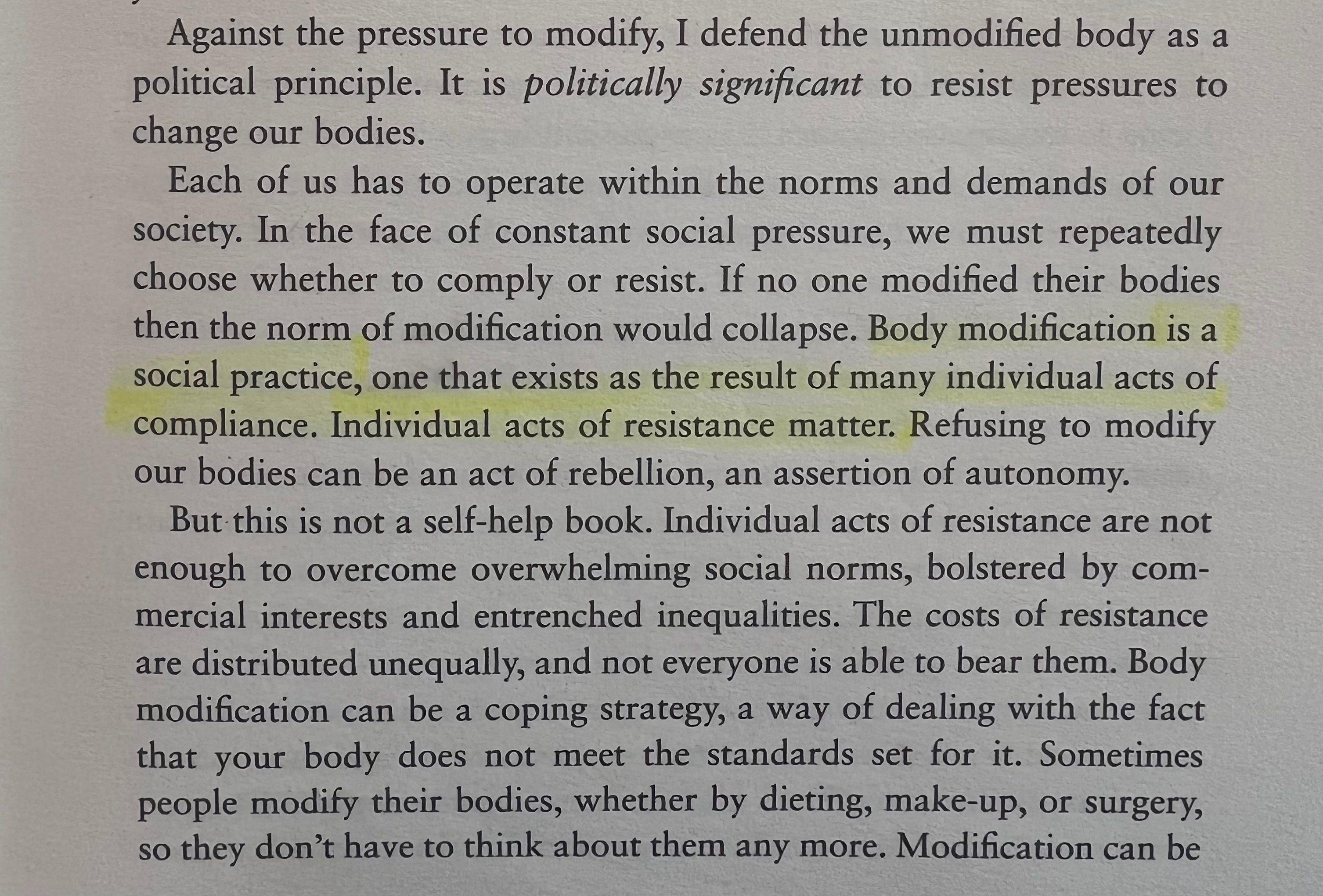 Jessica DeFino (me): You frame the unmodified body as a political principle. How does the pressure to modify – even if modification is framed as self-care, self-expression, and empowerment, as it often is in the beauty industry – hold people back politically?