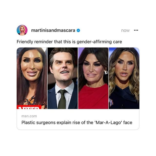 What the media is calling “Mar-A-Lago Face” — more on that in this week’s podcast episode — is absolutely not “gender-affirming care.” Matt Gaetz is not affirming his manhood with lifted eyebrows. Laura Loomer is not affirming her womanhood with a facelift. Plastic surgery is a tool, and like any tool, it can be used for many different purposes. You can use a hammer to build a house or bash someone’s head in. You can use cosmetic procedures to expand the limits of gender (as in gender-affirming surgery) or enforce them (as in their most common uses). In the case above, cosmetic intervention is being used to signal class and power — it’s an in-your-face, on-my-face display of wealth, not a caring affirmation of gender identity.