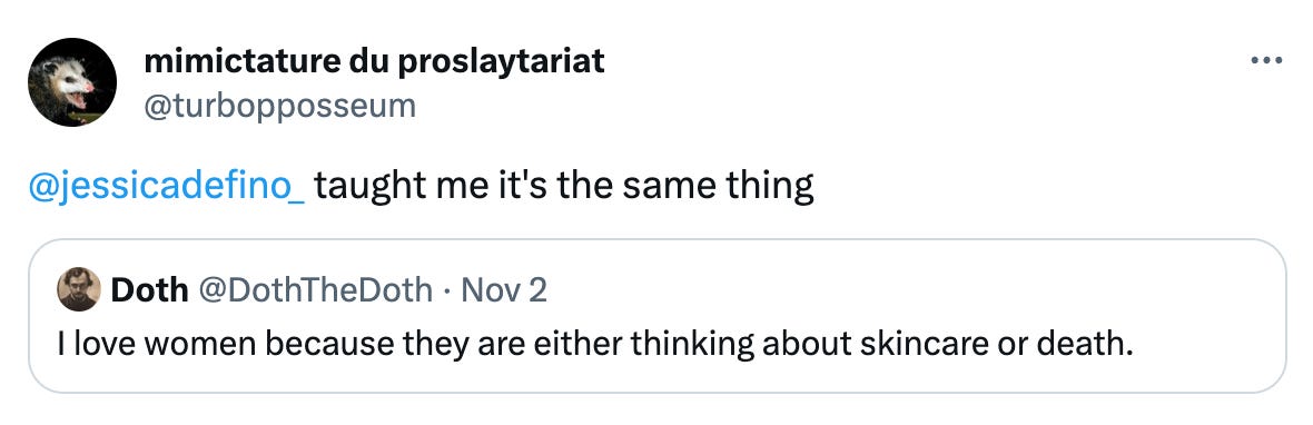 I’m also not convinced the motivation for skincare-obsessed teens is anti-aging so much as pro-avatar. Virtual technology is arguably the biggest influence on beauty standards today — Instagram Face, “Filter Serum,” et al. — and the hallmark of an online avatar is that it’s frozen in time and space. It’s not human, not alive, not aging. There is significant overlap between idealized tech and idealized youth, so the output is pretty much the same. But I do think the input may be different?
