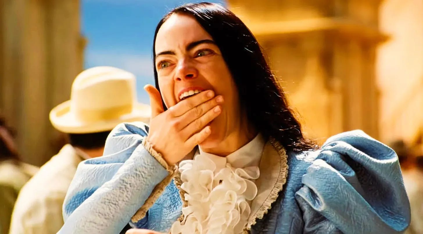 This is the question at the center of Poor Things, one it attempts to answer by putting an infant’s brain in Bella’s adult body1 and sending her out into the world, uncaged, without the gendered lessons of girlhood to guide her. As her mind matures — from that of a toddler, to an adolescent discovering masturbation (with an apple! origin of all sin!), to a horny teen fucking (“Why do people not just do this all the time?”) and reading philosophy (“Emerson speaks about the improvement of men … Perhaps he does not know any women”), to, finally, an embodied adult — her behavior highlights how social norms sever us from instinct, curiosity, common sense, caring.