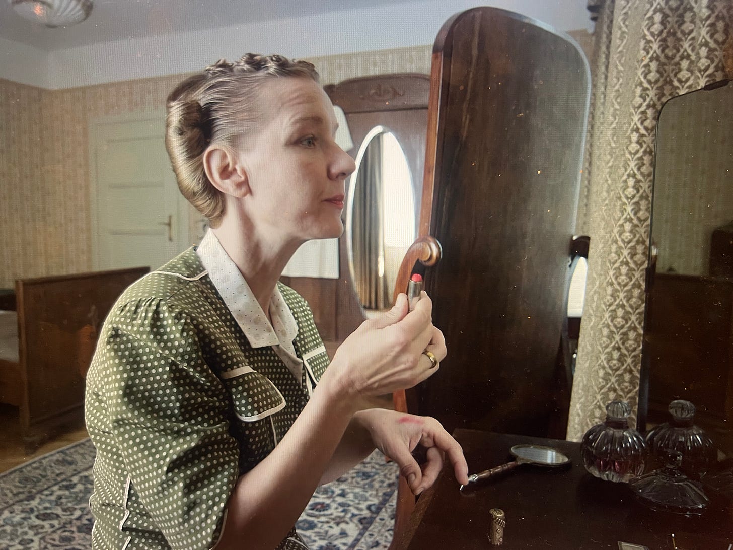 It made me think of a scene from The Zone of Interest, a recent film about the Holocaust centered on Auschwitz commandant Rudolf Höss and his family. In the film, the commandant’s wife applies red lipstick looted from a Jewish home, admires herself in the mirror, smacks her lips. She later asks her husband to bring her more “goodies” from the Jewish women now living, and soon dying, in the concentration camps.