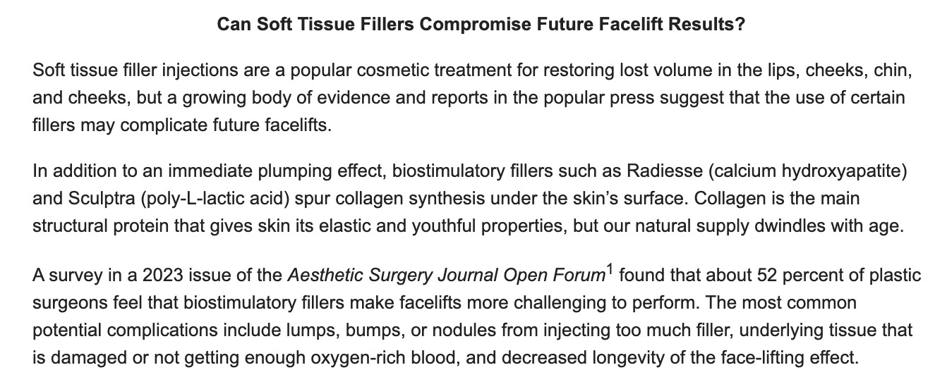AAFPRS notes that “a growing body of evidence and reports in the popular press suggest that the use of certain fillers may complicate future facelifts.” Personally, I don’t think The Great Dissolve has anything to do with acceptance, pushing back against beauty standards, etc. It likely has more to do with growing knowledge about filler complications and the fact that face lifts are surging in popularity while “the average age of facelift patients has gone down.” Those with the means are opting (or will opt) for more extreme anti-aging measures.