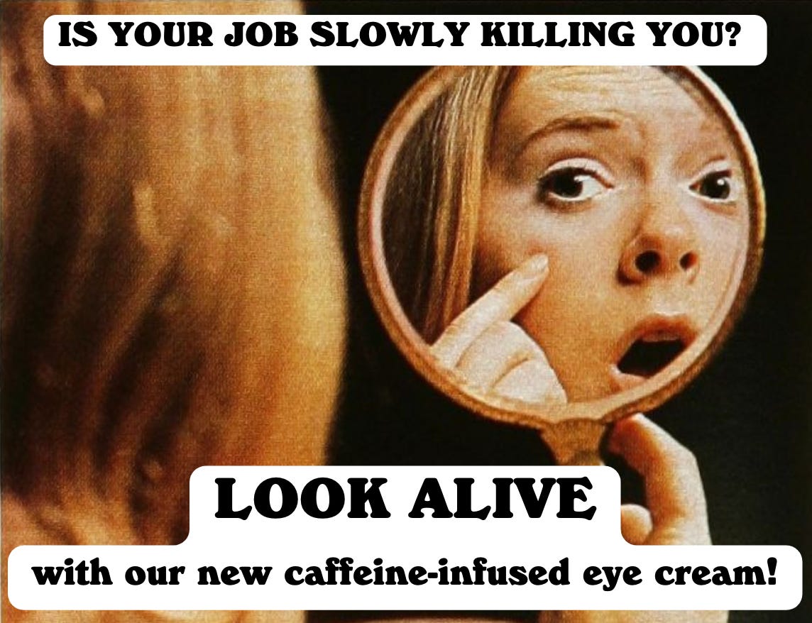 How the beauty industry convinces overtired, overworked customers to spend the money they make from the work that makes them tired on eye cream.