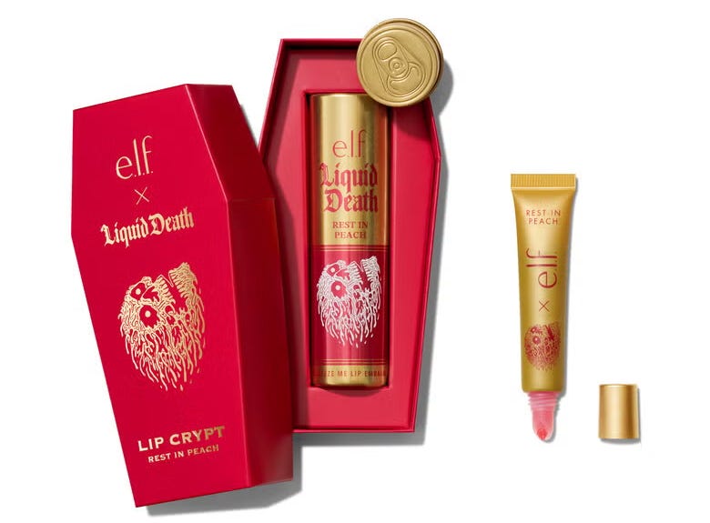 E.l.f. Cosmetics released its second collaboration with Liquid Death: “Lip Embalms” in coffin-shaped packages — AKA, “Lip Crypts” — “serving death to chapped lips” in shades like “Rest in Peach” and “Doctor Death.” The product is already sold out (or, in e.l.f. parlance, “No Longer With Us”).
