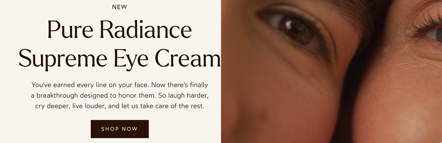 How does it propose to “honor” these lines? By negating them, naturally. A full “100%” of clinical trial participants “saw a highly significant improvement in fine lines and wrinkles” after using Pure Radiance Supreme Eye Cream, the brand boasts. Translation: Live your life — we’ll make it look like you didn’t! I’m not sure if the True Botanicals marketing team needs psychoanalysis or studies it. This is classic disavowal (accepting reality while denying reality).