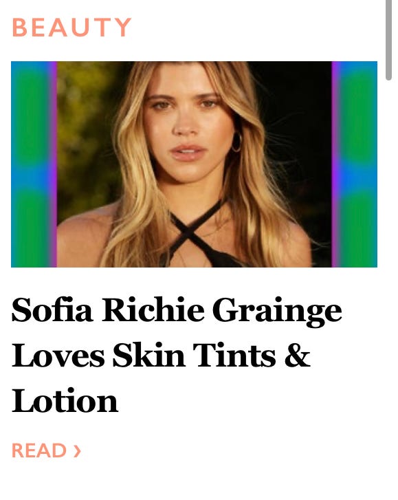 This Refinery 29 headline is fine, it just made me lol because it’s so unbelievably boring and who cares: “Sophia Richie Grainge Loves Skin Tints & Lotion.”